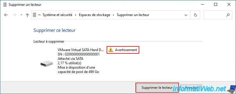 Pour lancer la reconstruction du disque manquant pour votre espace de stockage de type "miroir double" (RAID 1 logiciel), vous devez tenter de supprimer le disque physique possédant le statut "Avertissement" (que vous avez d'ailleurs débranché physiquement à l'étape précédente de ce tutoriel).