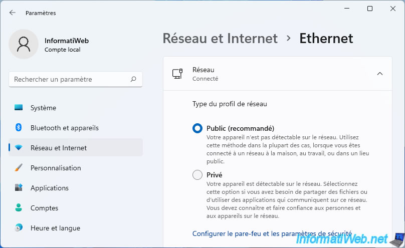 Par défaut, Windows 11 a sélectionné le type de profil de réseau "Public (recommandé)".