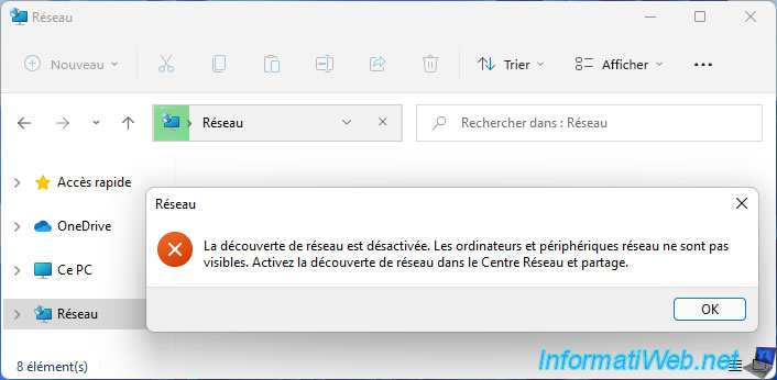 Allez dans la section "Réseau" de l'explorateur de fichiers et un message d'erreur apparaitra concernant la découverte de réseau (si Windows 11 considère votre réseau comme un réseau public).