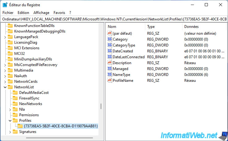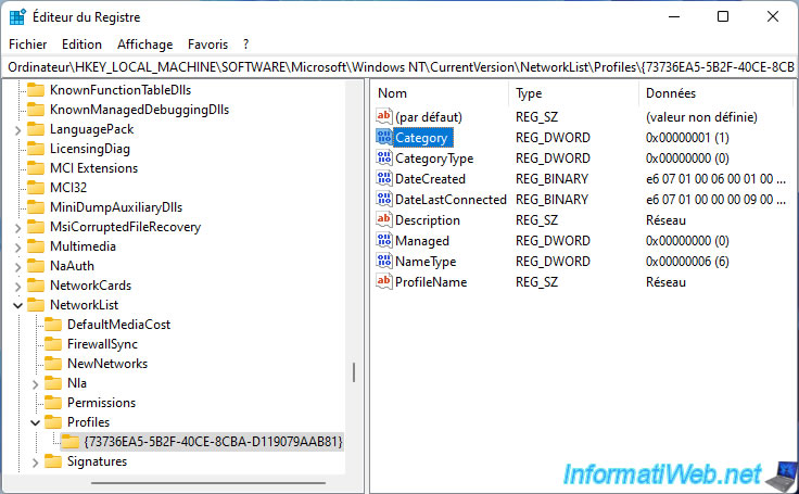 Pour finir, il est aussi possible de modifier le type d'emplacement réseau de n'importe quel réseau connu (réseau auquel vous vous êtes connecté au moins une fois) en utilisant l'éditeur du registre de Windows 11.